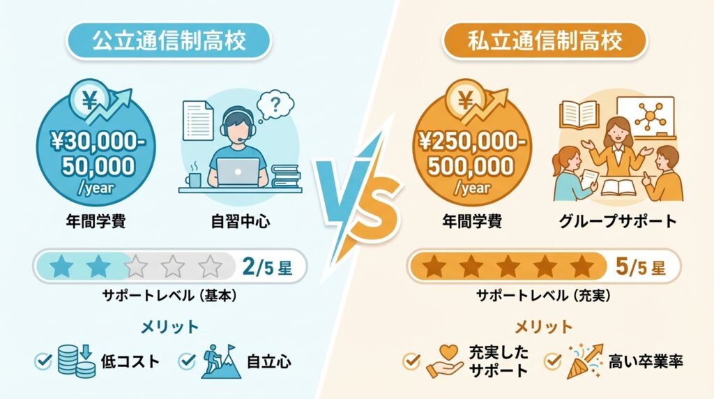 公立通信制高校は学費が非常に安い一方、サポート体制は限定的です。一方、私立通信制高校は学費が高めですが、担任制度や個別指導、進路サポートが手厚いのが特徴です。
