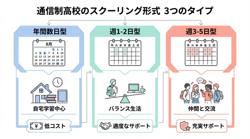 通信制高校には、大きく分けて以下の3つの通学スタイルがあります。