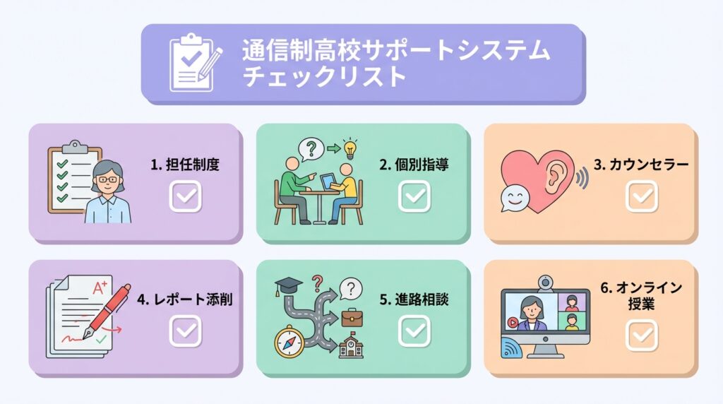 ここまでのポイントを踏まえて、通信制高校を比較する際のチェックリストをまとめました。学校見学や資料請求の際に、ぜひ活用してください。
