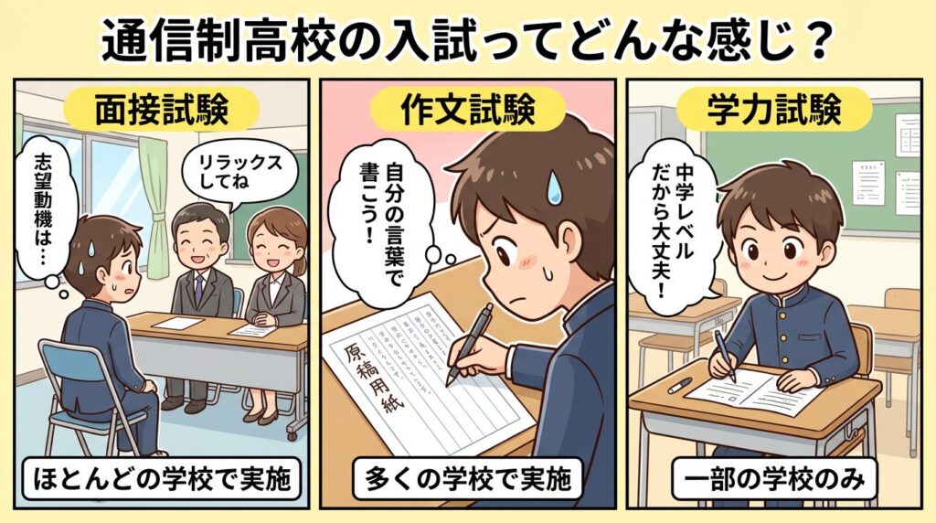 • 通信制高校の入試は面接・作文が中心で、合格率が高い