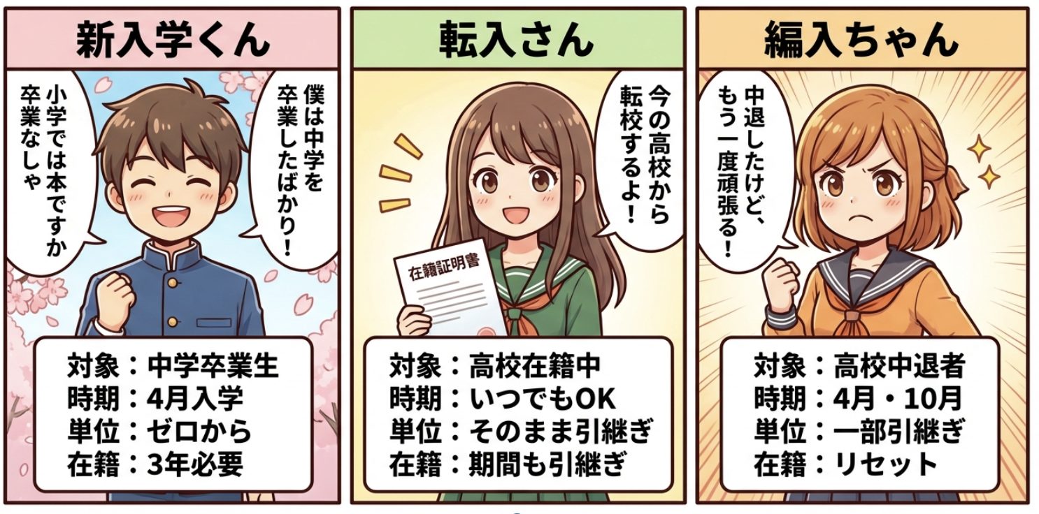 • 転入学:現在の高校から通信制高校に「転校」する(在籍期間・単位がそのまま引き継がれる)
