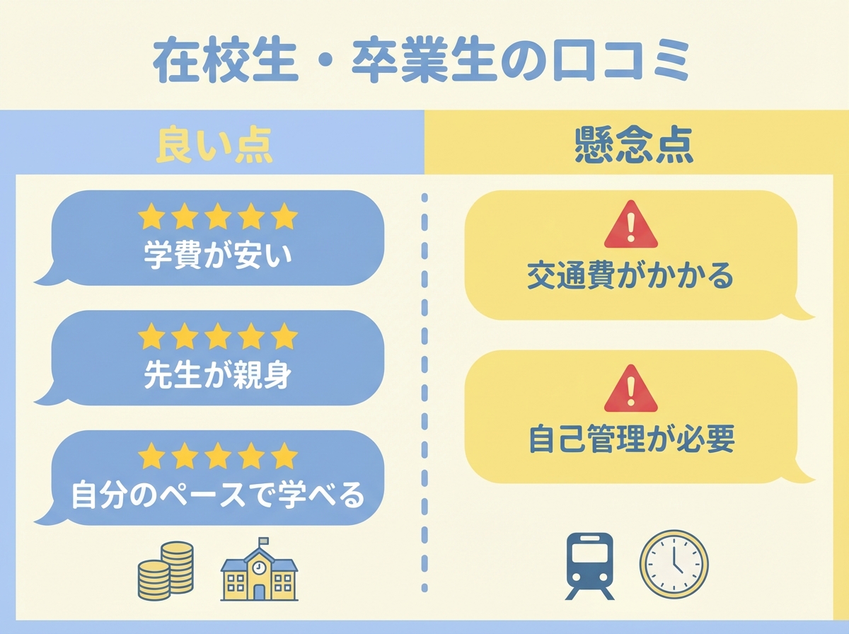 全体的には、「学費が安い」「先生が親身」「自分のペースで学べる」といったポジティブな評価が多い一方で、「交通費がかかる」「自己管理が必要」という点には注意が必要という声も見られます。