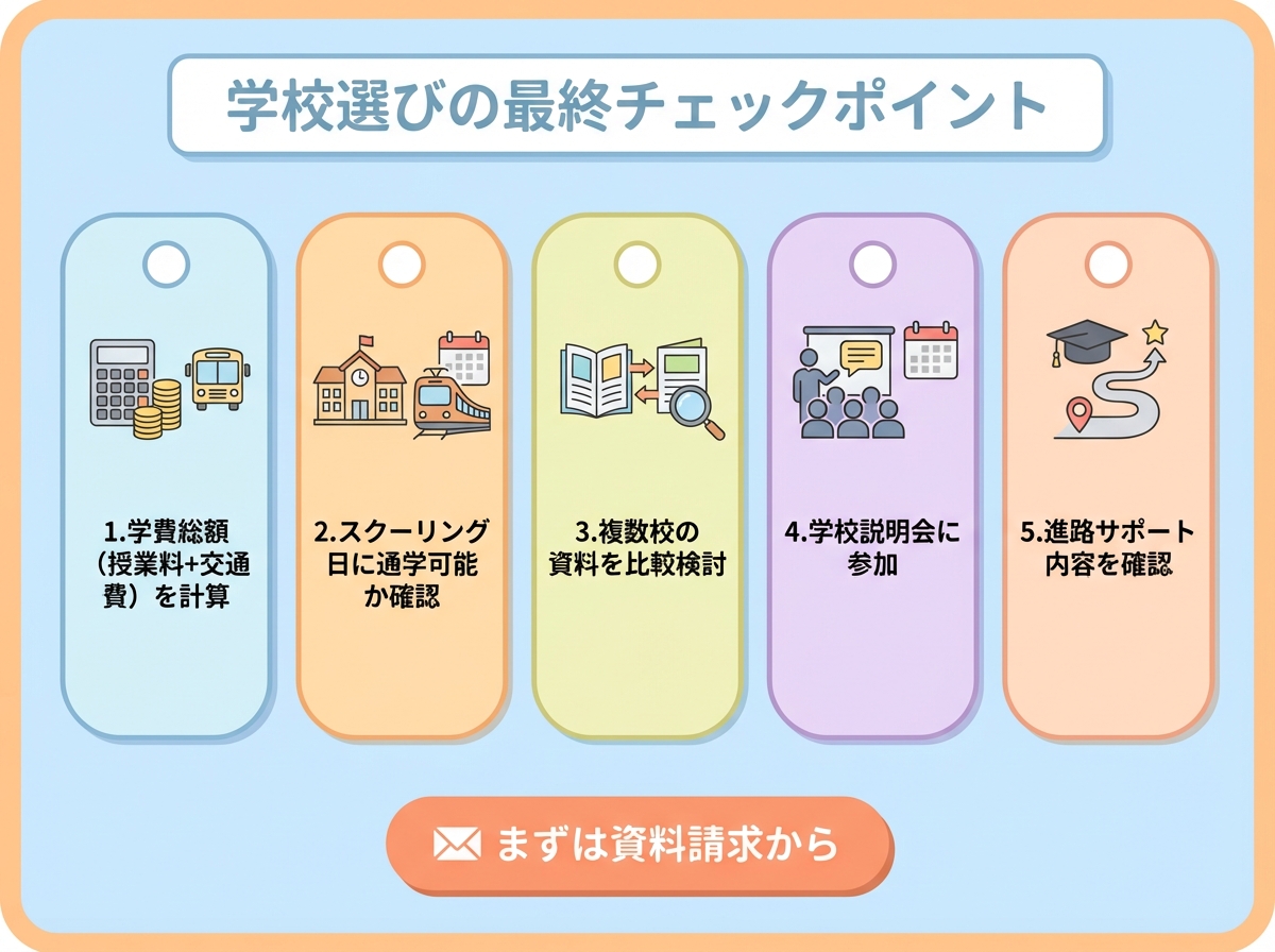 交通費込みでトータルコストを比較すると、私立通信制の方が結果的に安く済むケースもあるため、複数の学校を比較検討することが大切です。