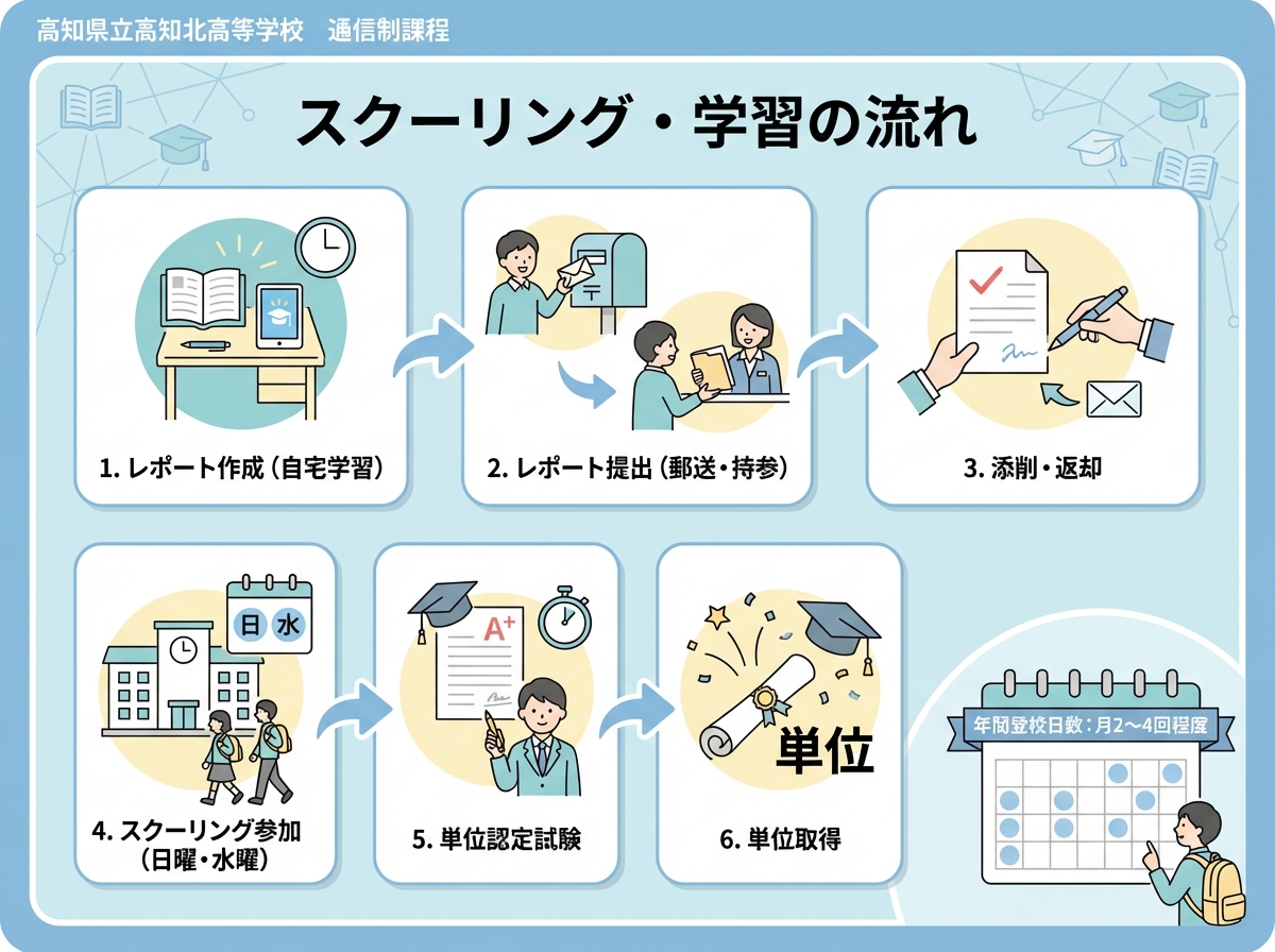 高知県立高知北高等学校の通信制では、以下のような流れで学習を進めます。