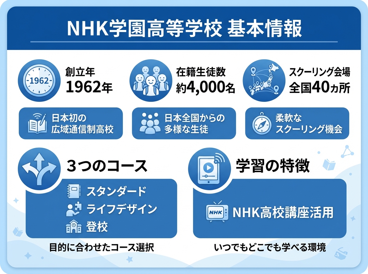 | NHK学園高等学校 | 約38.5万円~ | 月1~2回または年3~4日 | NHK高校講座活用、全国40会場 |