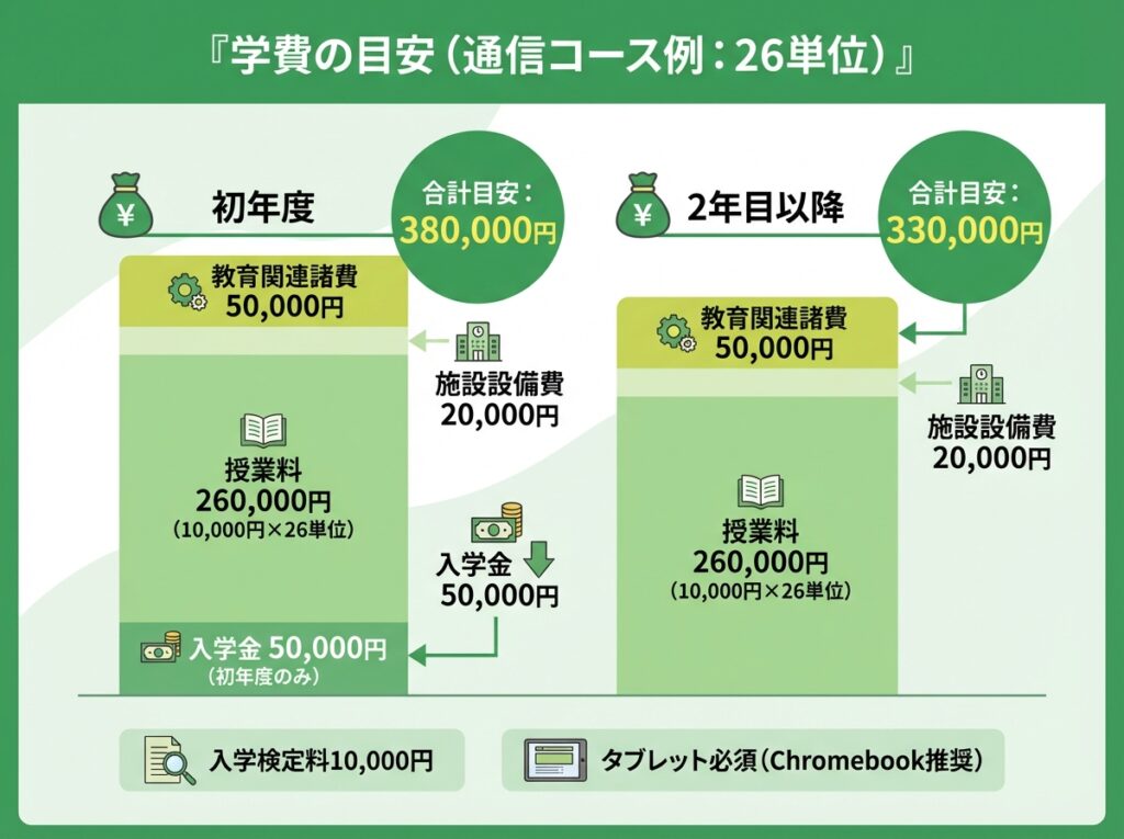 通信コースの年間学費の概算は以下の通りです(26単位履修の場合)。