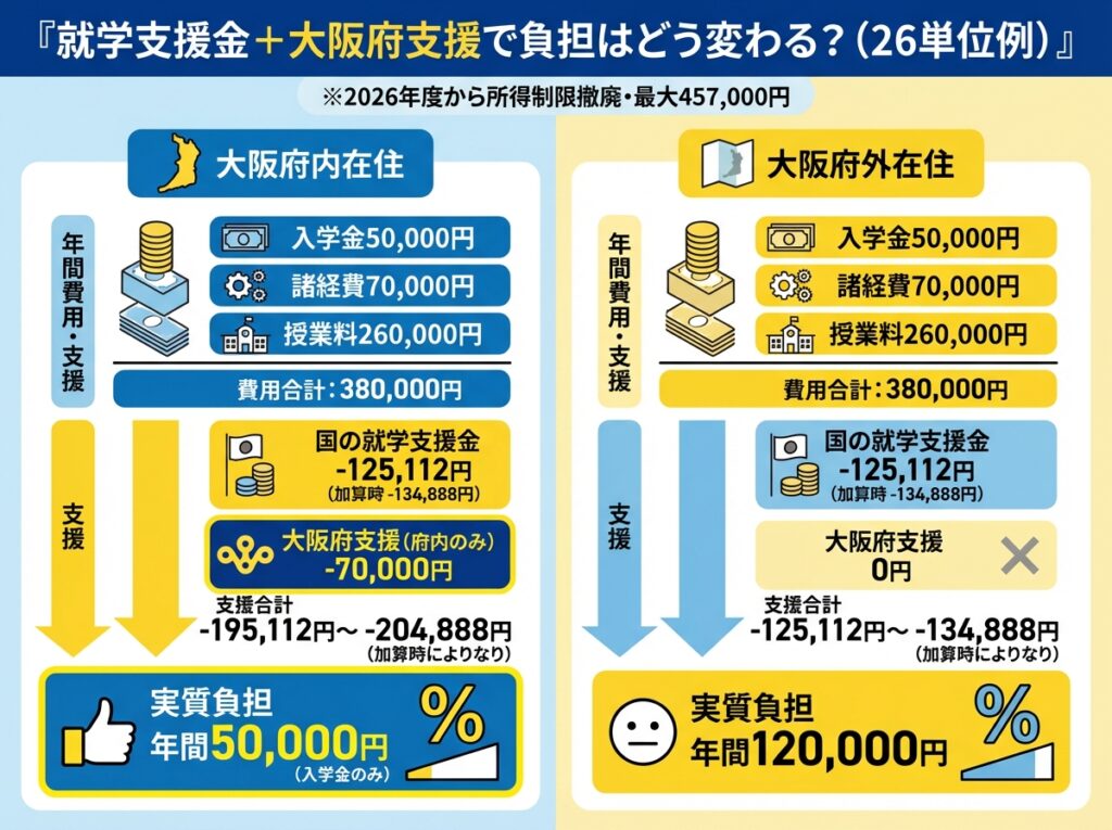 大阪府に住んでいる世帯の場合、国の就学支援金に加えて大阪府の授業料支援補助金制度も利用できるため、初年度は入学金50,000円のみが実質負担額となります。2年目以降は諸経費の70,000円のみの負担で済む可能性があります。