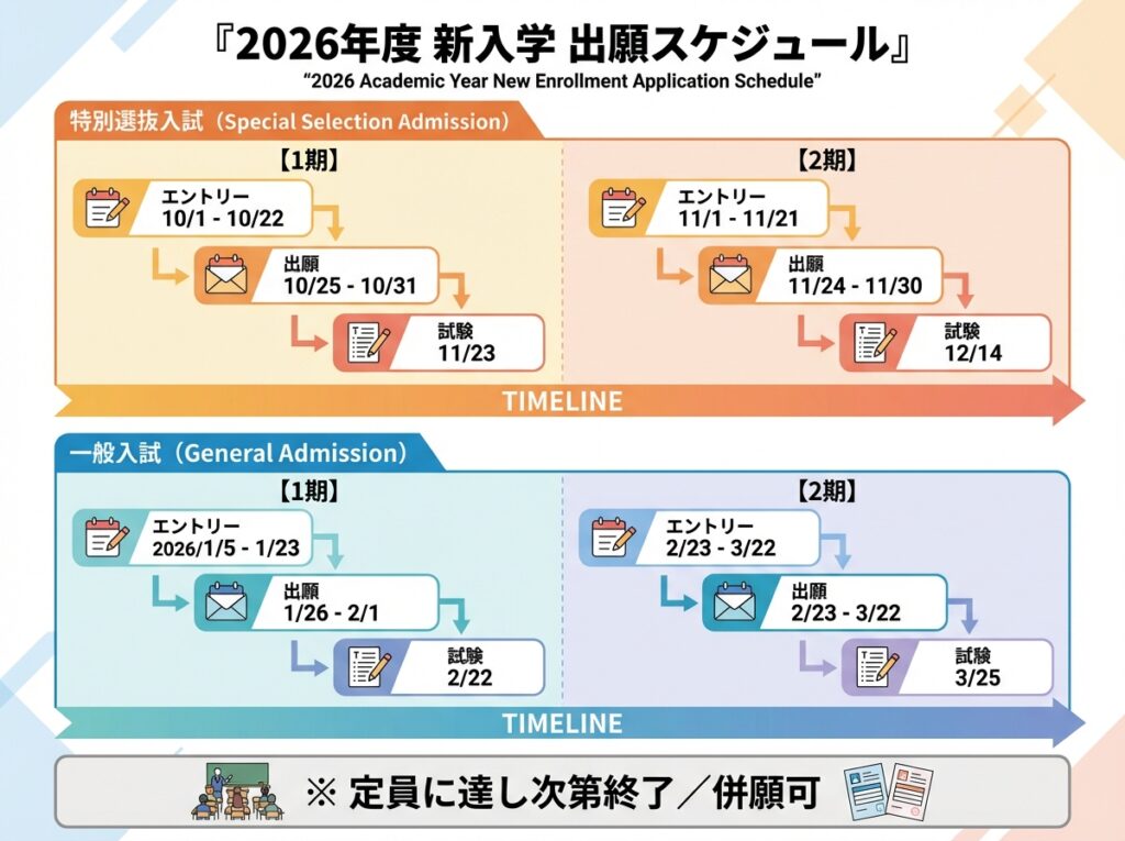 | 募集時期 | 特別選抜:10月~12月/一般入試:1月~3月 |