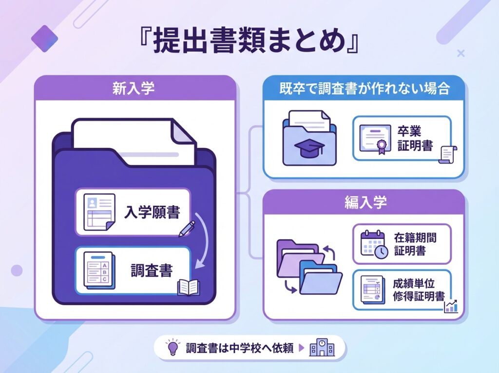 入学する時に提出しなければいけない書類は、入学願書と調査書の2種類です。入学願書は自分で書くことができますが、調査書は通っている中学校に作成を依頼することが必要です。