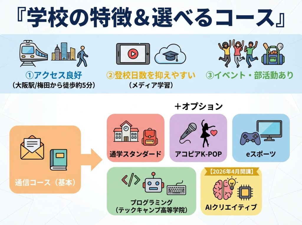この学校の通学スタンダードコースでは、基礎学力の向上に力を入れているので、中学生の時の勉強をよく理解できなかった生徒であっても、基本から勉強し直すことができます。K-POPのアイドルになりたい人は、アコピアK-POPコースに入学して授業を受けることができ、eスポーツのプロプレイヤーになりたい人は、eスポーツコースで勉強ができます。