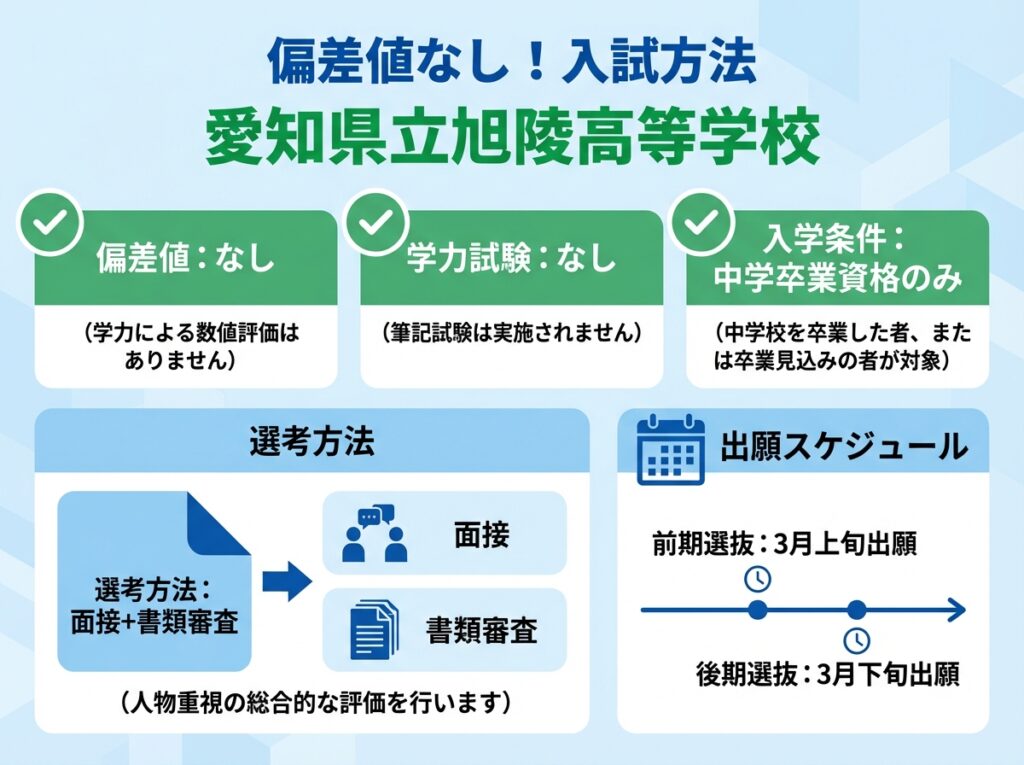 愛知県立旭陵高等学校に偏差値はあるの?と気になるかもしれませんが、結論、旭陵高等学校に偏差値はありません。