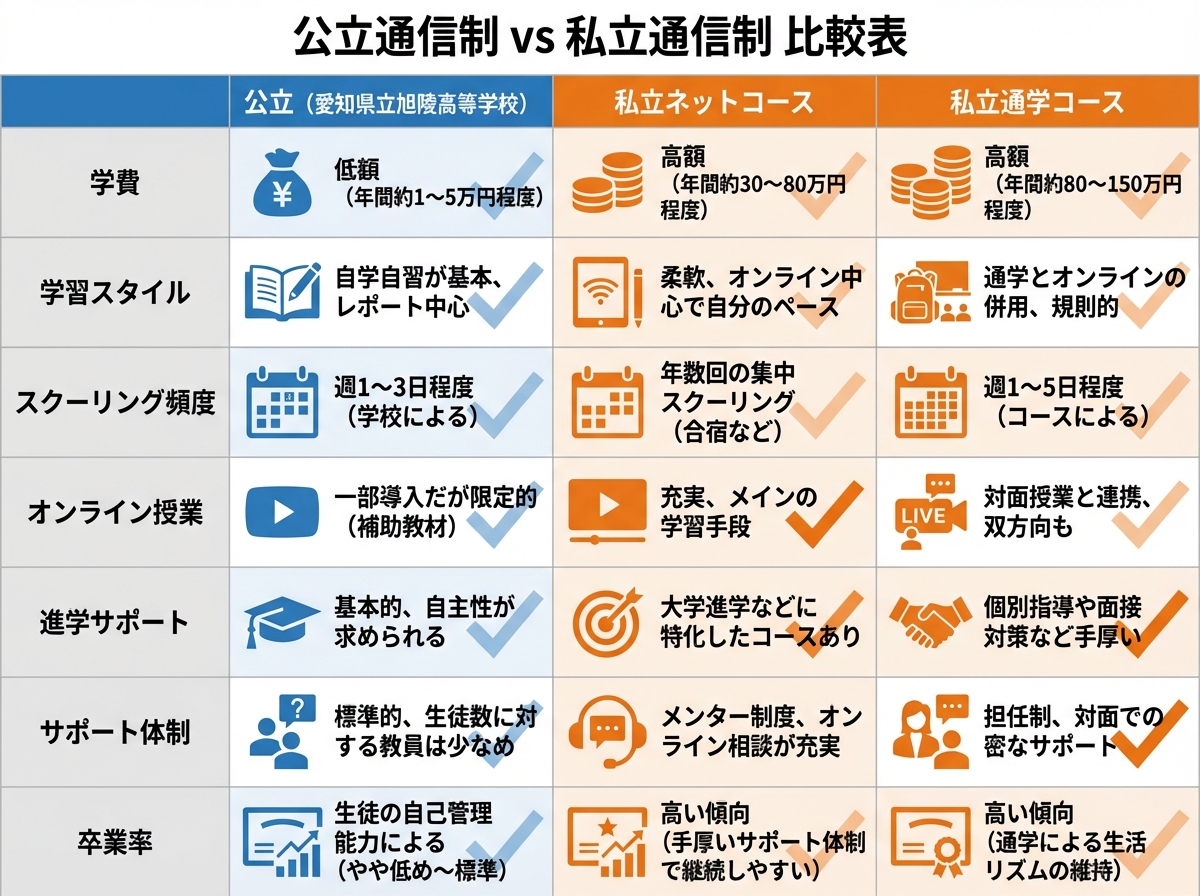 愛知県立旭陵高等学校のような公立通信制高校と、私立通信制高校、どちらを選ぶべきか迷っている方も多いでしょう。ここでは比較ポイントをまとめます。