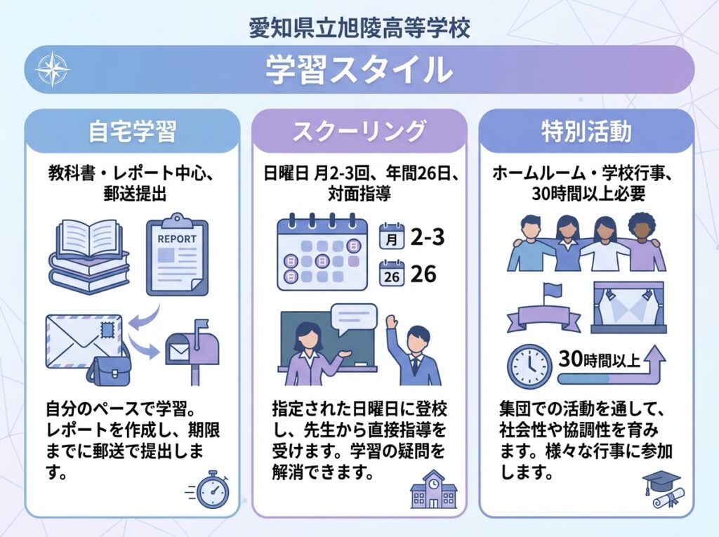 愛知県立旭陵高等学校は通信制ですが、定期的な通学(スクーリング)が必要です。