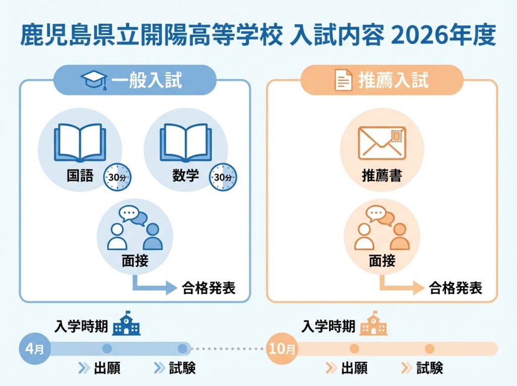 鹿児島県立開陽高等学校の入試は、4月入学と10月入学のタイミングで実施されます。入試形態は「一般入試」と「推薦入試」の2種類です。