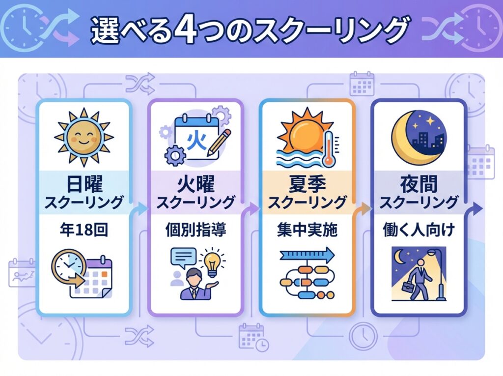 スクーリングには複数の種類があり、自分のライフスタイルに合わせて選択できるのが大きな特徴です: