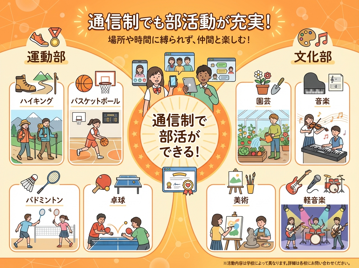 ハイキング部やバスケットボール部などの運動部、園芸部や音楽部などの文化部があり、充実した高校生活を送ることができます。通信制高校に通いながら部活動にも参加したいという生徒にとって、選択肢の一つとなる学校です。