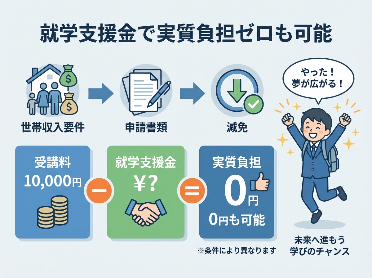 高等学校等就学支援金制度を利用できる場合、受講料の負担は実質ゼロになる可能性があります。