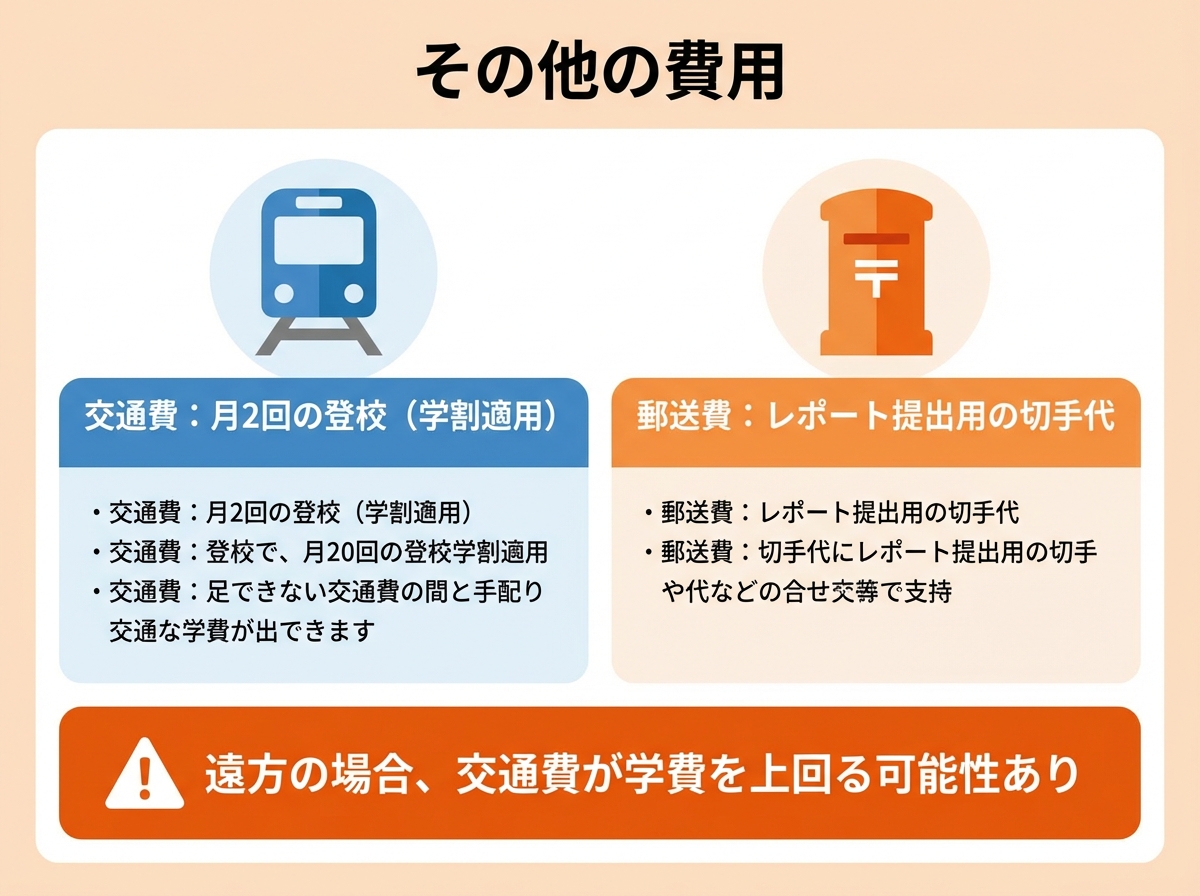 - 交通費:月に2回程度の登校時の交通費。学生割引回数券が適用されます。