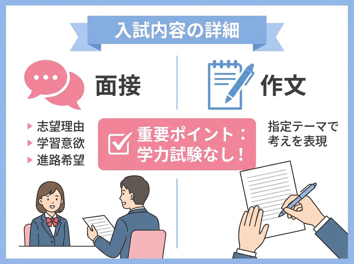 偏差値がない理由は、「願書提出」「面接」「作文」のみで学力テストによる選考が行われないからです。つまり、中学校での成績や学力に関係なく、誰でも平等に入学のチャンスがあるということです。