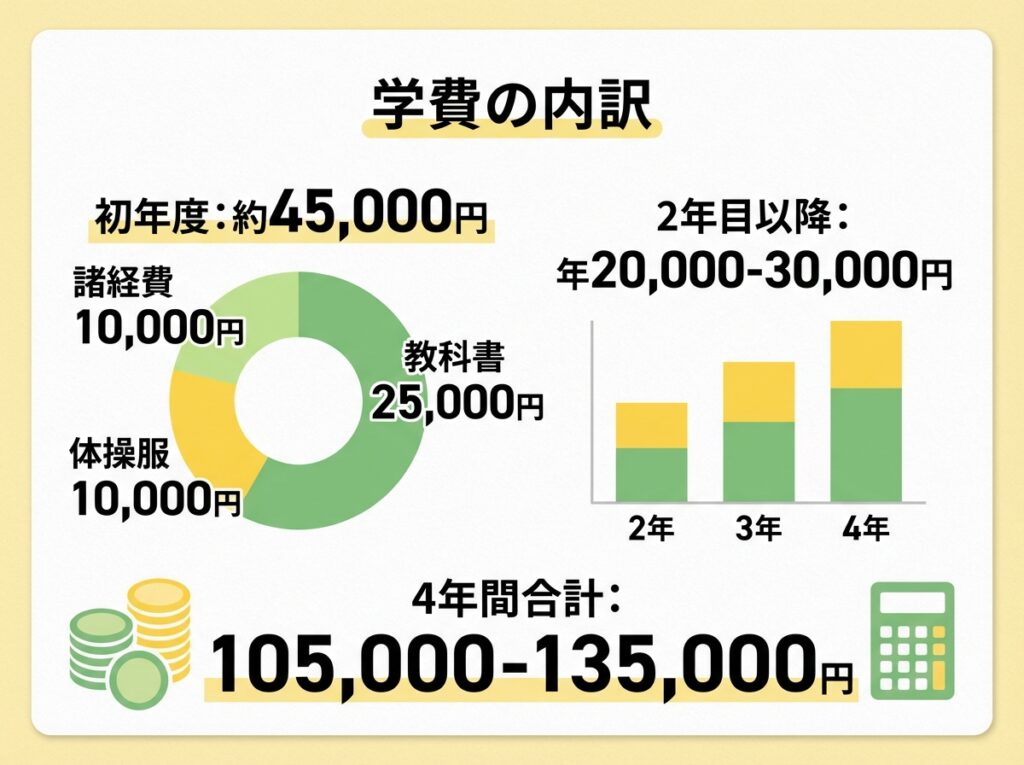 入学時に必要な費用は、教科書や学習書、体操服や通信費などを含めて合計約45,000円です。
