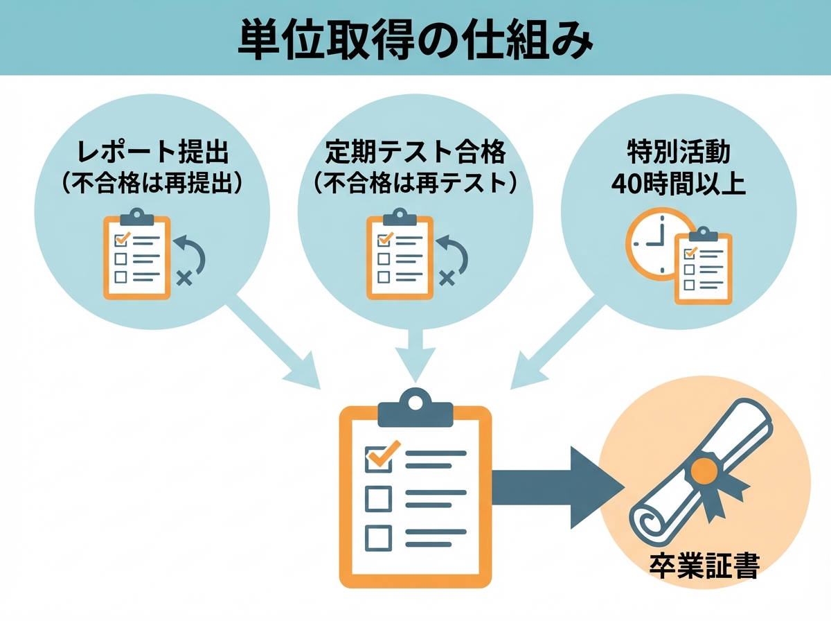 レポートは各教科ごとに決められた回数を提出する必要があり、不合格の場合は再提出が必要です。また、スクーリングで行われる定期テストにも合格しなければ単位が取得できません。
