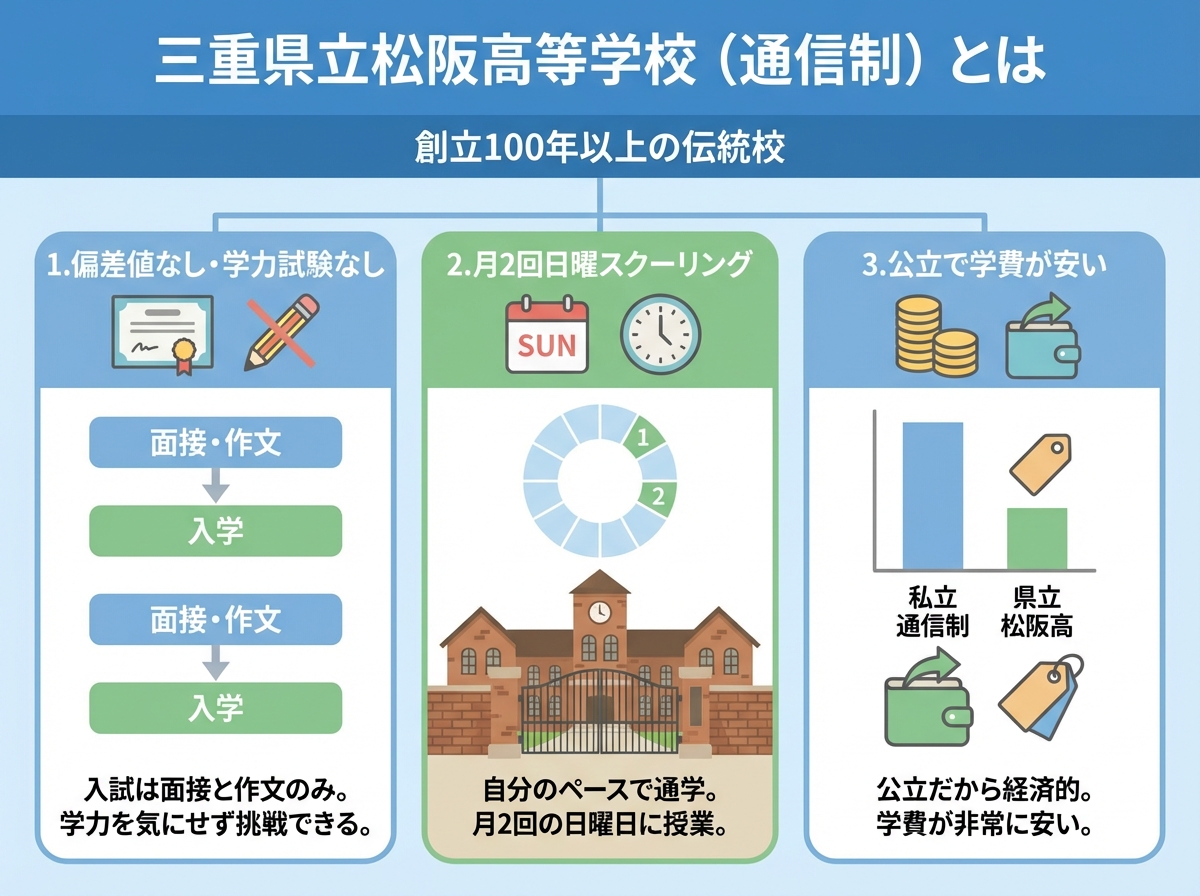 三重県立松阪高等学校の通信制は、学費が安く、偏差値もないため入学しやすいという大きなメリットがあります。また、100年以上の歴史を持つ公立高校という安心感もあります。