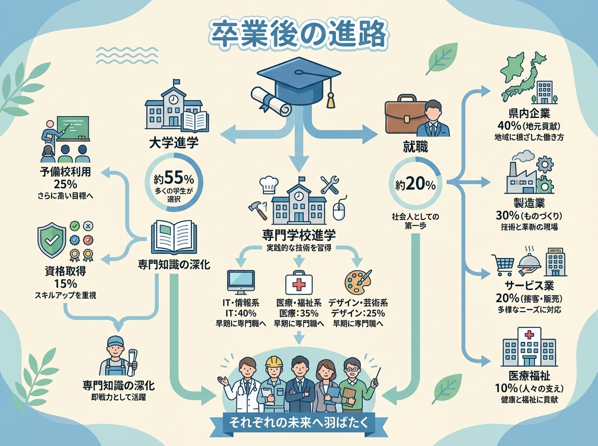 - 進路指導:進学・就職それぞれに対応した個別指導を実施