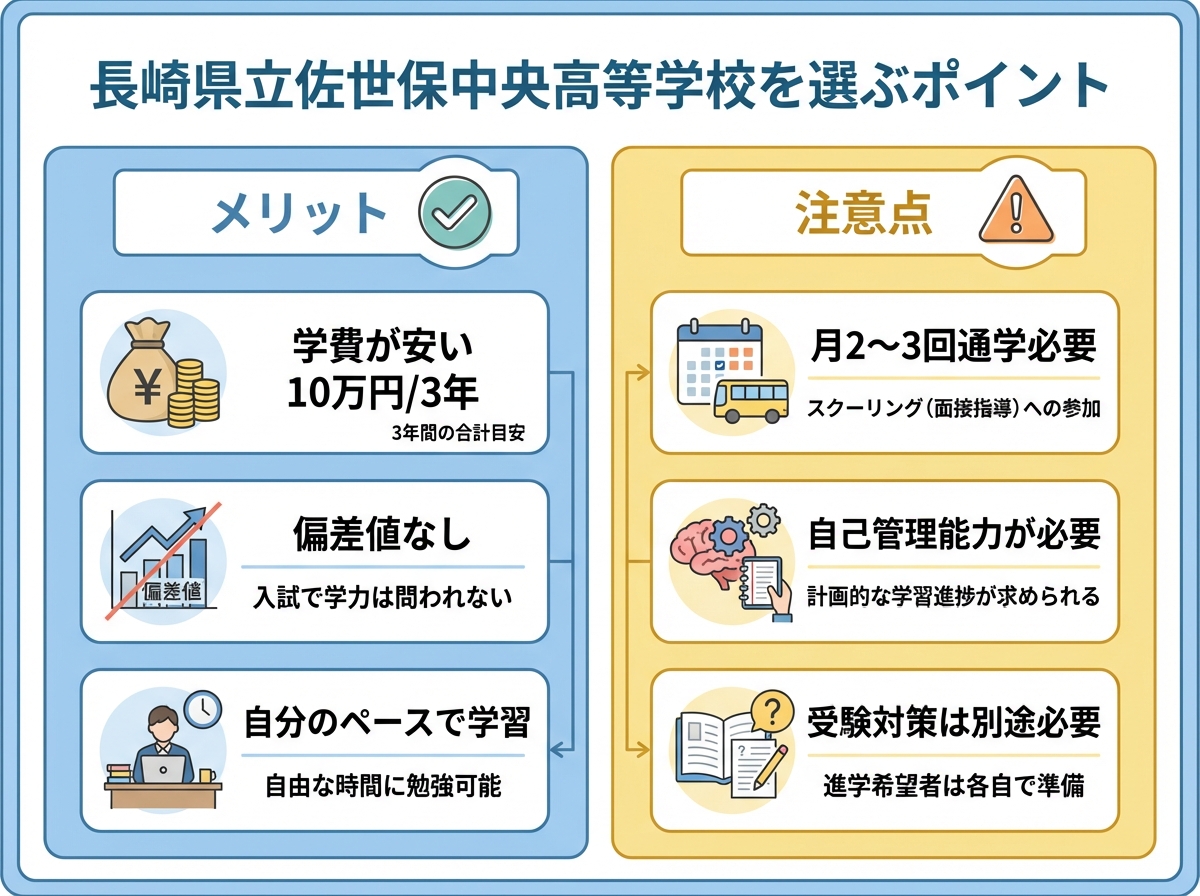 口コミからもわかるように、佐世保中央高校は学費の安さやサポート体制の充実が評価されている一方で、自己管理能力や計画性が求められる学校です。自分のライフスタイルや学習スタイルに合っているかどうか、しっかりと見極めることが大切です。