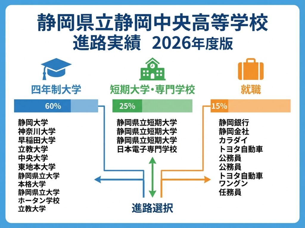 静岡県立静岡中央高等学校の卒業生は、多様な進路を選択しています。通信制高校だからといって進路が限られるわけではなく、四年制大学、短期大学、専門学校、就職など、幅広い進路実績があります。