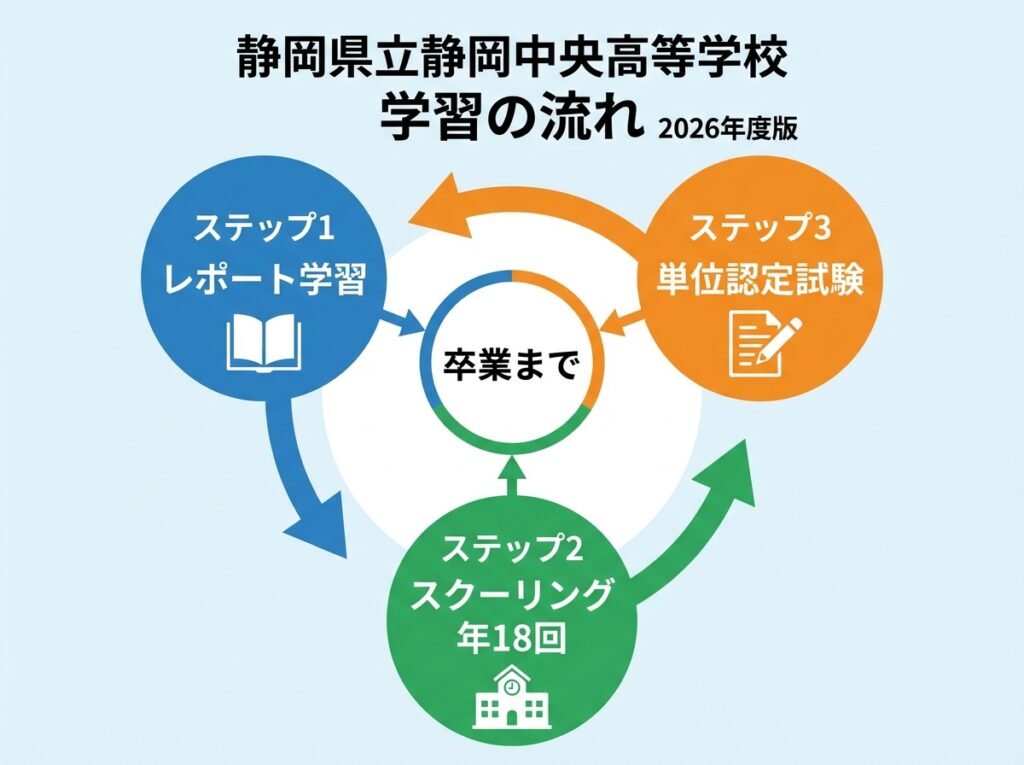 静岡県立静岡中央高等学校の通信制の学習は、通信制高校の基本である以下の3つのステップで進められます。
