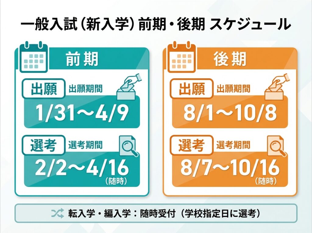 | 募集時期 | 専願:2025/10/1〜2026/1/22 一般前期:2026/1/31〜2026/4/9 一般後期:2026/8/1〜2026/10/8 |