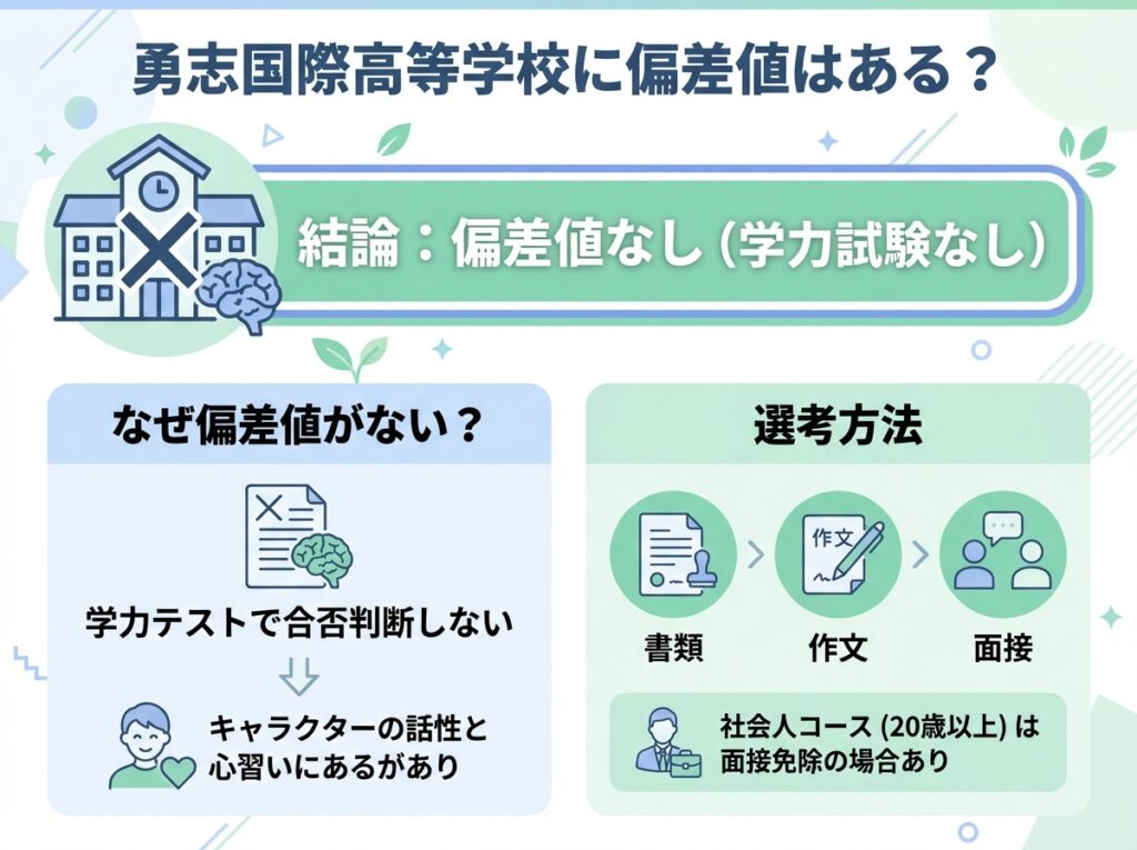 勇志国際高等学校に偏差値はあるの?と気になるかもしれませんが、結論、勇志国際高等学校に偏差値はありません。