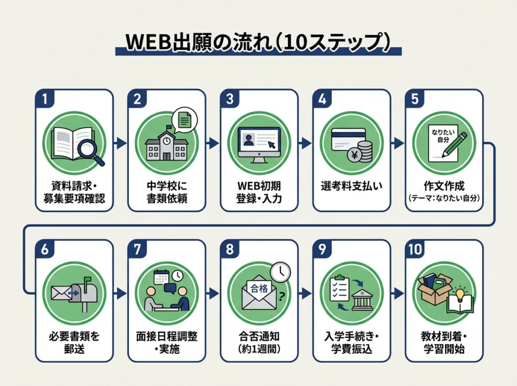 勇志国際高等学校の出願はすべてWEB出願となっています。出願から入学までの流れは以下の通りです。