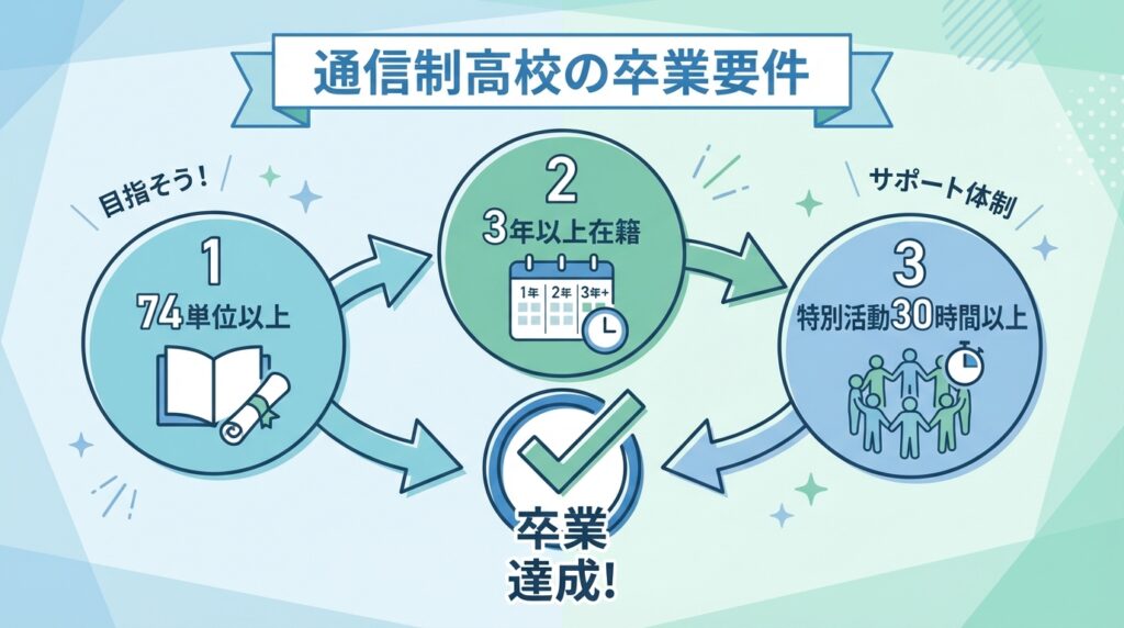 通信制高校を卒業するには、以下の3つの要件をすべて満たす必要があります。