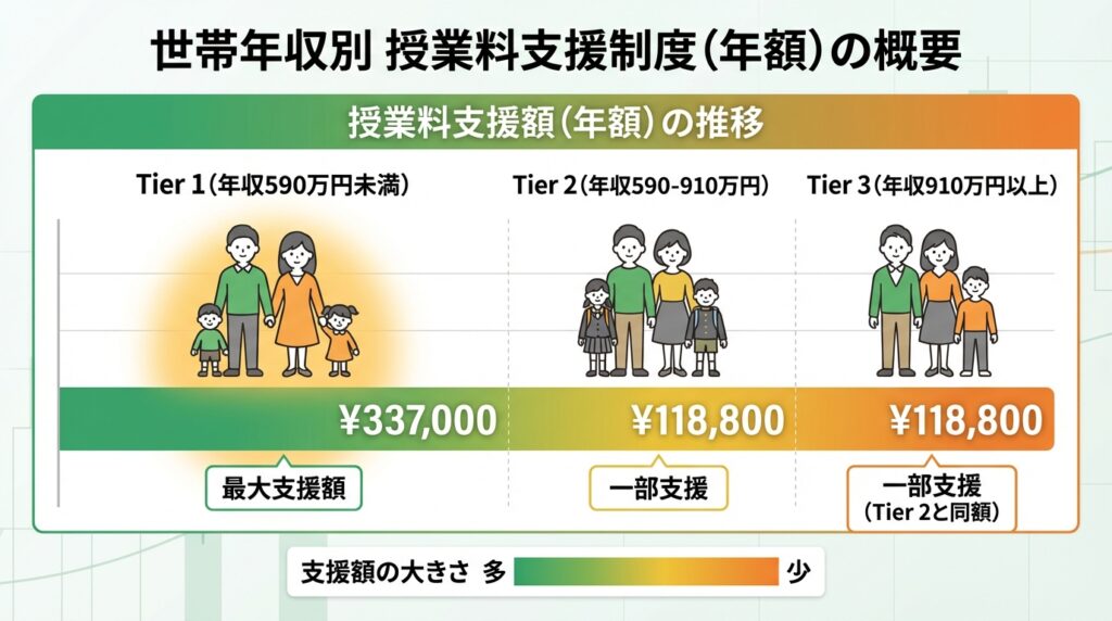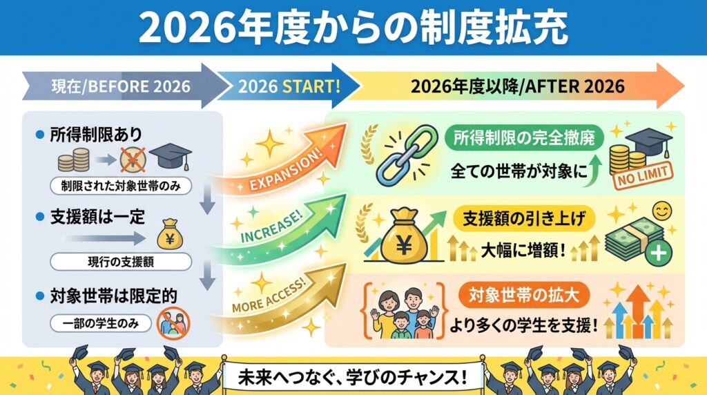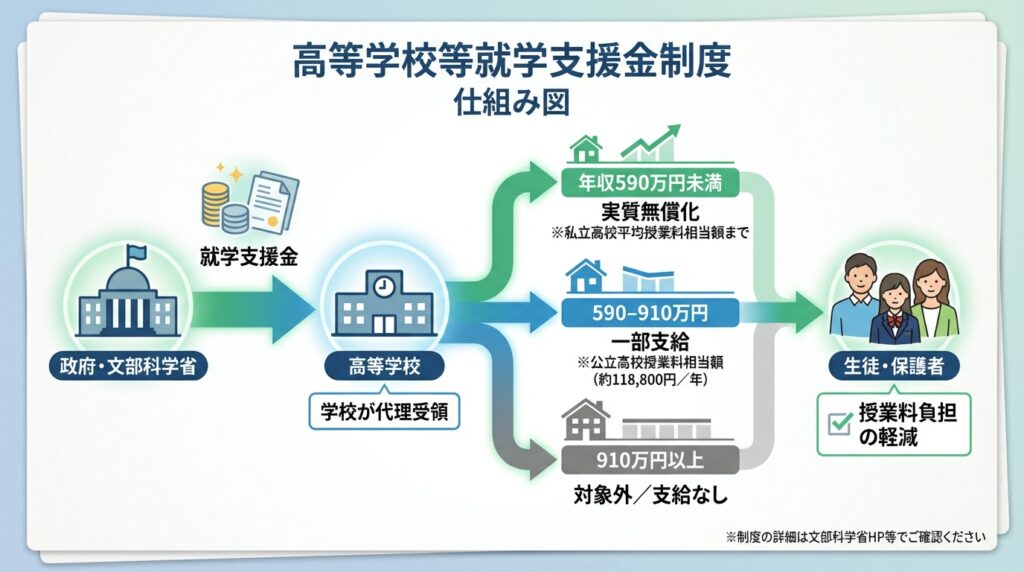 - 就学支援金:2026年度から所得制限撤廃。すべての世帯が対象に