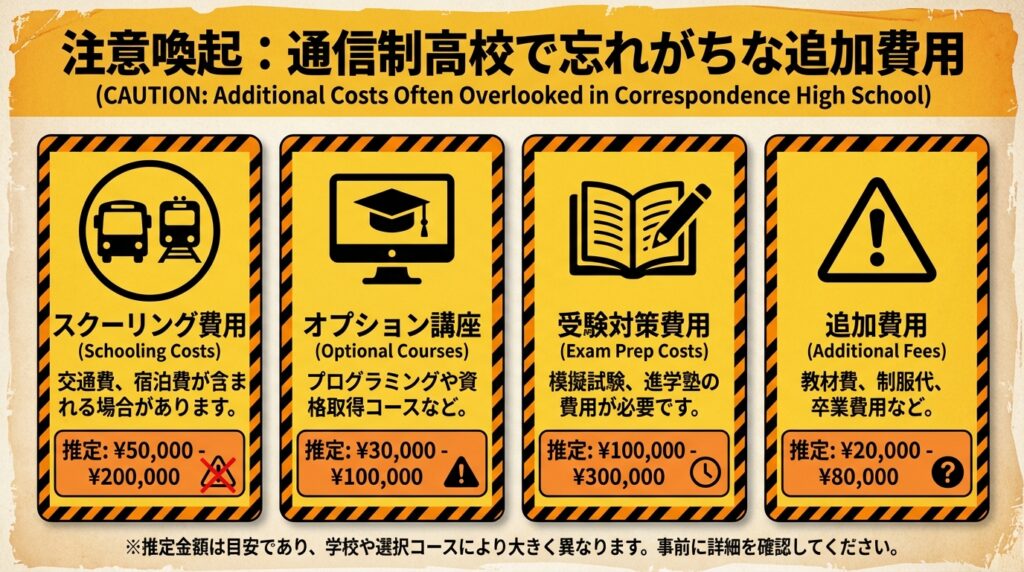 - 追加スクーリング費:1回あたり3,000〜5,000円