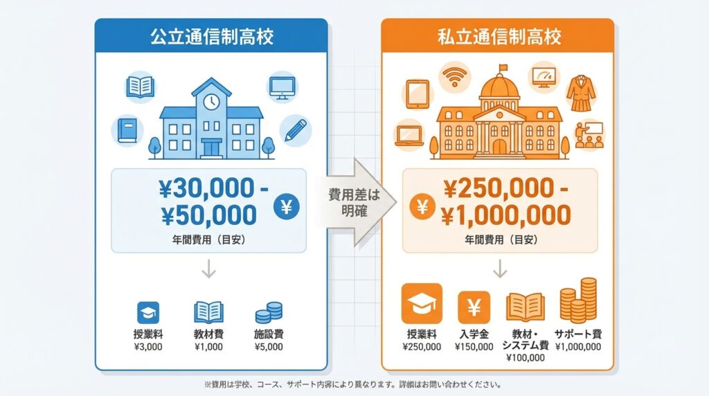 公立通信制高校は全日制高校よりも大幅に学費が安いのが特徴です。私立通信制高校は通学頻度によって費用が変動しますが、サポート体制を重視する場合は私立全日制と同程度の費用がかかることもあります。