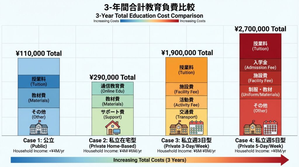 - 民間サポート校の併用:学習サポートが必要な場合、年間30〜50万円追加